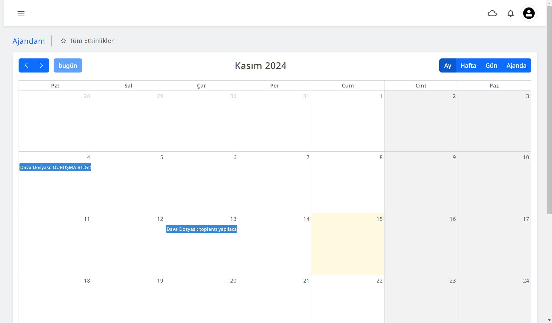 Ajanda, davalar ve görevlerle entegre çalışır. Bu özellik sayesinde, belirli bir davaya veya göreve ait tarihleri ajandanızda görüntüleyebilir ve tüm iş süreçlerinizi tek bir yerden takip edebilirsiniz. Ayrıca görevlerinize bağlı hatırlatmalar oluşturarak hiçbir detayı gözden kaçırmazsınız.