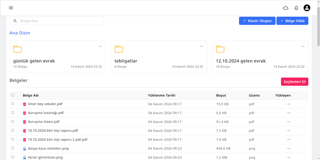 Avukat Asistanı Kişisel Cloud, dosyalarınızı düzenli ve kullanıcı dostu bir şekilde organize etmenizi sağlar. Dosyalarınızı dava numarasına, müvekkil adına veya dosya türüne göre sınıflandırarak hızlıca bulabilirsiniz. Bu düzenli yapı, işlerinizi daha planlı ve sistemli bir şekilde yürütmenize yardımcı olur.