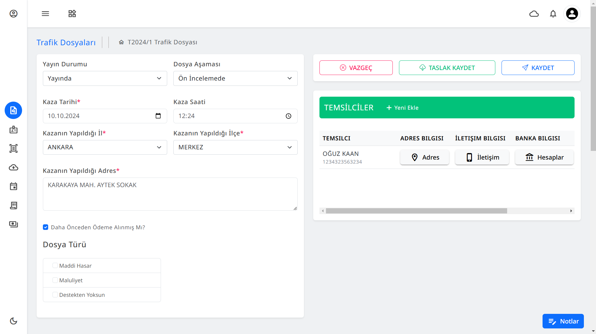 Trafik kazası dosyalarınızın genel durumunu izlemek için kapsamlı raporlama özelliklerinden faydalanabilirsiniz. Her dosya için detaylı analiz yapabilir, sürecin ilerleyişini değerlendirebilir ve müvekkillerinize daha doğru bilgiler sunabilirsiniz. Raporlama, sürecin etkin bir şekilde yönetilmesi için kararlar almanıza yardımcı olur.
